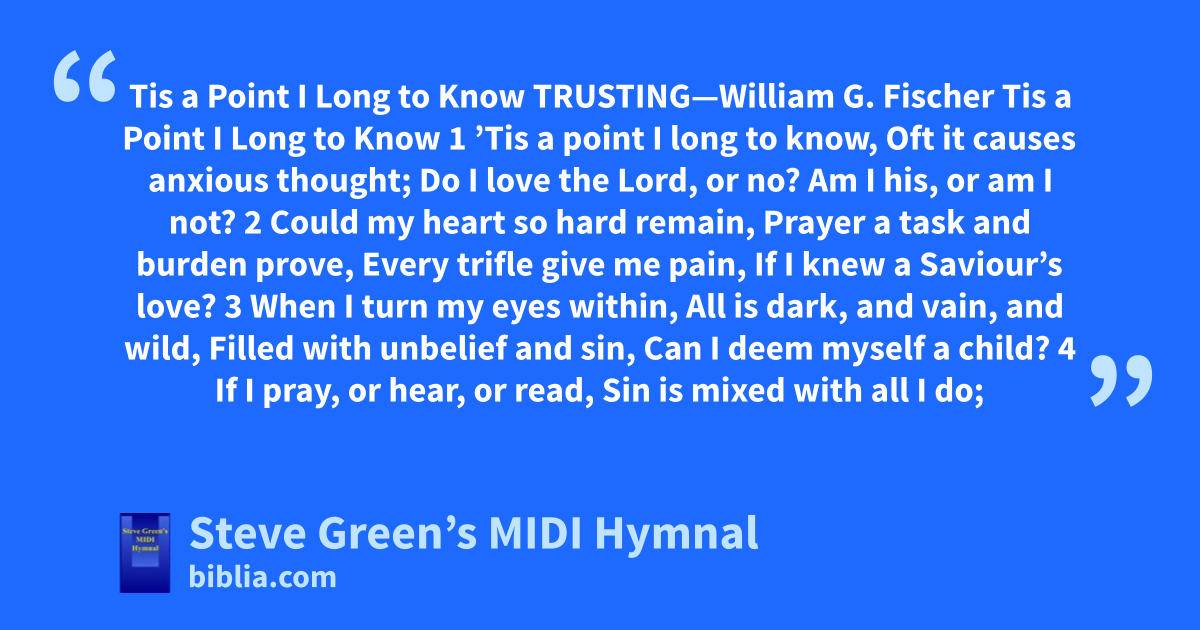 Tis a Point I Long to Know TRUSTING—William G. Fischer Tis a Point I Long to Know 1 ’Tis a point I long to know, Oft it causes anxious thought; Do I love the Lord, or no? Am I his, or am I not? 2 Could my heart so hard remain, Prayer a task and burden prove, Every trifle give me pain, If I knew a Saviour’s love? 3 When I turn my eyes within, All is dark, and vain, and wild, Filled with unbelief and sin, Can I deem myself a child? 4 If I pray, or hear, or read, Sin is mixed with all I do;