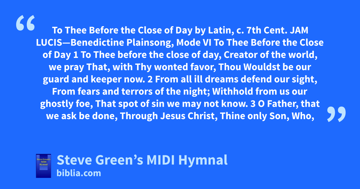 To Thee Before the Close of Day by Latin, c. 7th Cent. JAM LUCIS—Benedictine Plainsong, Mode VI To Thee Before the Close of Day 1 To Thee before the close of day, Creator of the world, we pray That, with Thy wonted favor, Thou Wouldst be our guard and keeper now. 2 From all ill dreams defend our sight, From fears and terrors of the night; Withhold from us our ghostly foe, That spot of sin we may not know. 3 O Father, that we ask be done, Through Jesus Christ, Thine only Son, Who,