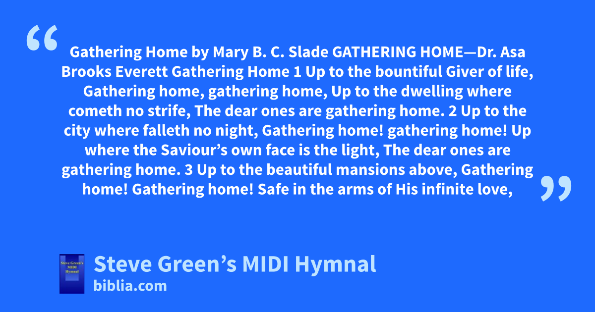 Gathering Home by Mary B. C. Slade GATHERING HOME—Dr. Asa Brooks Everett Gathering Home 1 Up to the bountiful Giver of life, Gathering home, gathering home, Up to the dwelling where cometh no strife, The dear ones are gathering home. 2 Up to the city where falleth no night, Gathering home! gathering home! Up where the Saviour’s own face is the light, The dear ones are gathering home. 3 Up to the beautiful mansions above, Gathering home! Gathering home! Safe in the arms of His infinite love,