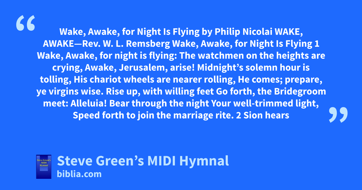 Wake, Awake, for Night Is Flying by Philip Nicolai WAKE, AWAKE—Rev. W. L. Remsberg Wake, Awake, for Night Is Flying 1 Wake, Awake, for night is flying: The watchmen on the heights are crying, Awake, Jerusalem, arise! Midnight’s solemn hour is tolling, His chariot wheels are nearer rolling, He comes; prepare, ye virgins wise. Rise up, with willing feet Go forth, the Bridegroom meet: Alleluia! Bear through the night Your well-trimmed light, Speed forth to join the marriage rite. 2 Sion hears