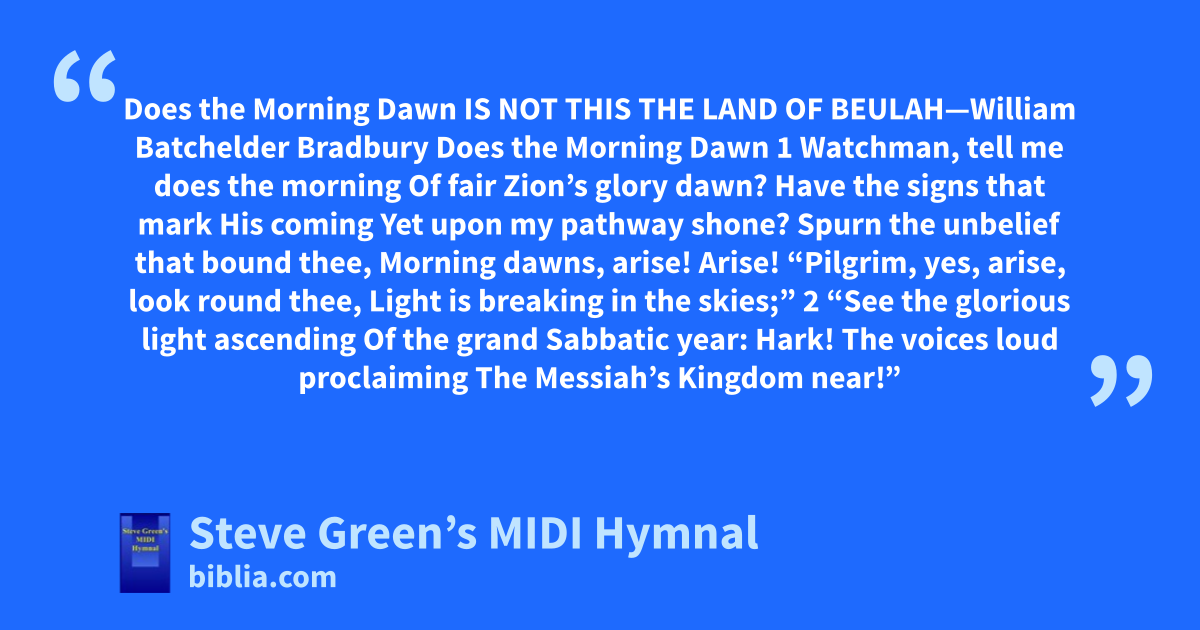Does the Morning Dawn IS NOT THIS THE LAND OF BEULAH—William Batchelder Bradbury Does the Morning Dawn 1 Watchman, tell me does the morning Of fair Zion’s glory dawn? Have the signs that mark His coming Yet upon my pathway shone? Spurn the unbelief that bound thee, Morning dawns, arise! Arise! “Pilgrim, yes, arise, look round thee, Light is breaking in the skies;” 2 “See the glorious light ascending Of the grand Sabbatic year: Hark! The voices loud proclaiming The Messiah’s Kingdom near!”