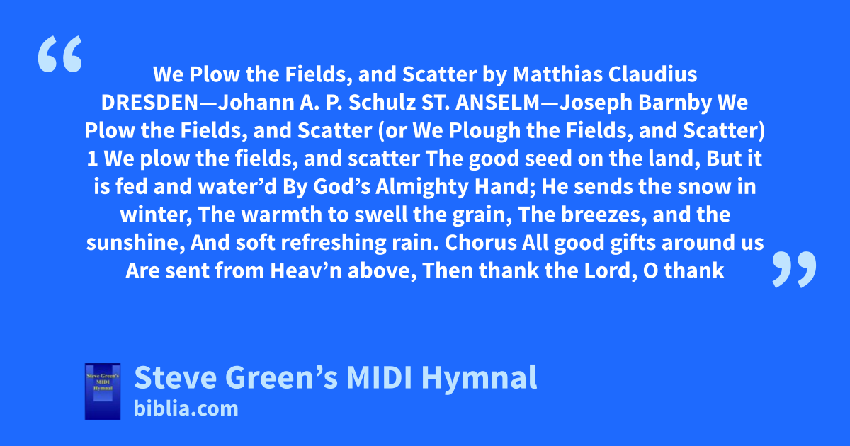 We Plow the Fields, and Scatter by Matthias Claudius DRESDEN—Johann A. P. Schulz ST. ANSELM—Joseph Barnby We Plow the Fields, and Scatter (or We Plough the Fields, and Scatter) 1 We plow the fields, and scatter The good seed on the land, But it is fed and water’d By God’s Almighty Hand; He sends the snow in winter, The warmth to swell the grain, The breezes, and the sunshine, And soft refreshing rain. Chorus All good gifts around us Are sent from Heav’n above, Then thank the Lord, O thank
