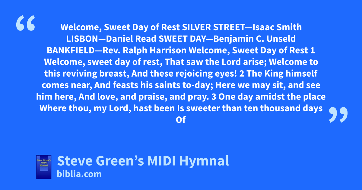 Welcome, Sweet Day of Rest SILVER STREET—Isaac Smith LISBON—Daniel Read SWEET DAY—Benjamin C. Unseld BANKFIELD—Rev. Ralph Harrison Welcome, Sweet Day of Rest 1 Welcome, sweet day of rest, That saw the Lord arise; Welcome to this reviving breast, And these rejoicing eyes! 2 The King himself comes near, And feasts his saints to-day; Here we may sit, and see him here, And love, and praise, and pray. 3 One day amidst the place Where thou, my Lord, hast been Is sweeter than ten thousand days Of