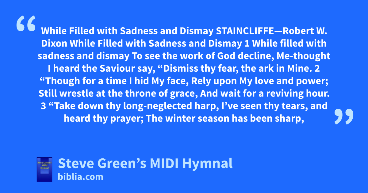 While Filled with Sadness and Dismay STAINCLIFFE—Robert W. Dixon While Filled with Sadness and Dismay 1 While filled with sadness and dismay To see the work of God decline, Me-thought I heard the Saviour say, “Dismiss thy fear, the ark in Mine. 2 “Though for a time I hid My face, Rely upon My love and power; Still wrestle at the throne of grace, And wait for a reviving hour. 3 “Take down thy long-neglected harp, I’ve seen thy tears, and heard thy prayer; The winter season has been sharp,