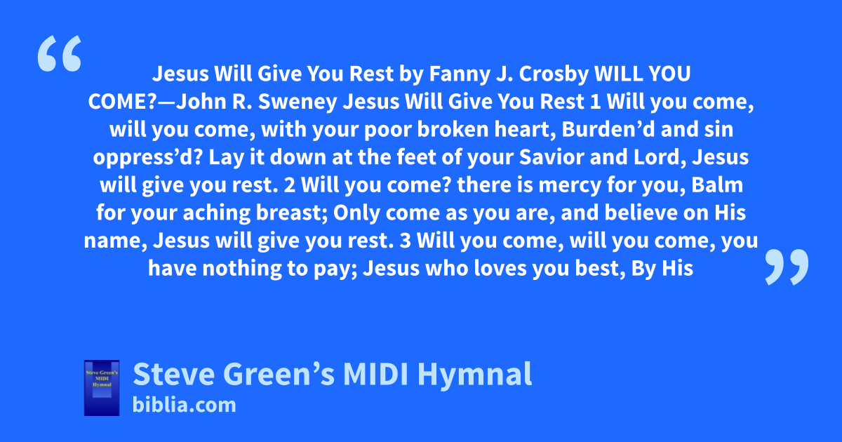 Jesus Will Give You Rest by Fanny J. Crosby WILL YOU COME?—John R. Sweney Jesus Will Give You Rest 1 Will you come, will you come, with your poor broken heart, Burden’d and sin oppress’d? Lay it down at the feet of your Savior and Lord, Jesus will give you rest. 2 Will you come? there is mercy for you, Balm for your aching breast; Only come as you are, and believe on His name, Jesus will give you rest. 3 Will you come, will you come, you have nothing to pay; Jesus who loves you best, By His