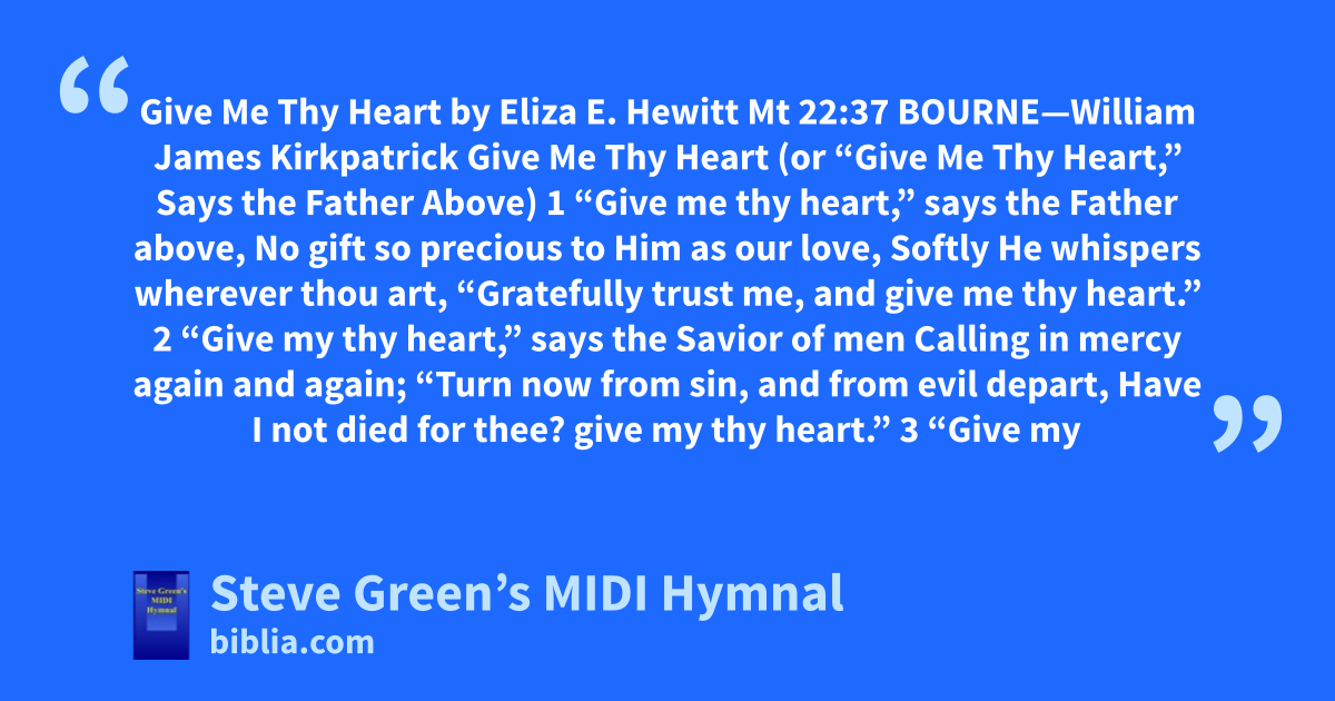 Give Me Thy Heart by Eliza E. Hewitt Mt 22:37 BOURNE—William James Kirkpatrick Give Me Thy Heart (or “Give Me Thy Heart,” Says the Father Above) 1 “Give me thy heart,” says the Father above, No gift so precious to Him as our love, Softly He whispers wherever thou art, “Gratefully trust me, and give me thy heart.” 2 “Give my thy heart,” says the Savior of men Calling in mercy again and again; “Turn now from sin, and from evil depart, Have I not died for thee? give my thy heart.” 3 “Give my