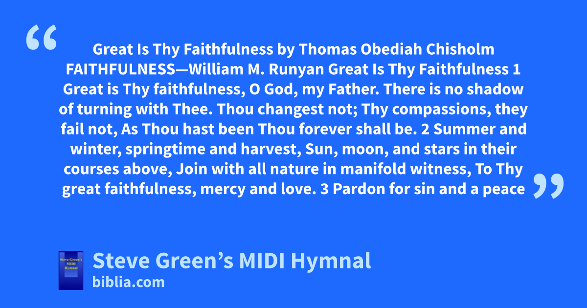 Great Is Thy Faithfulness by Thomas Obediah Chisholm FAITHFULNESS—William M. Runyan Great Is Thy Faithfulness 1 Great is Thy faithfulness, O God, my Father. There is no shadow of turning with Thee. Thou changest not; Thy compassions, they fail not, As Thou hast been Thou forever shall be. 2 Summer and winter, springtime and harvest, Sun, moon, and stars in their courses above, Join with all nature in manifold witness, To Thy great faithfulness, mercy and love. 3 Pardon for sin and a peace