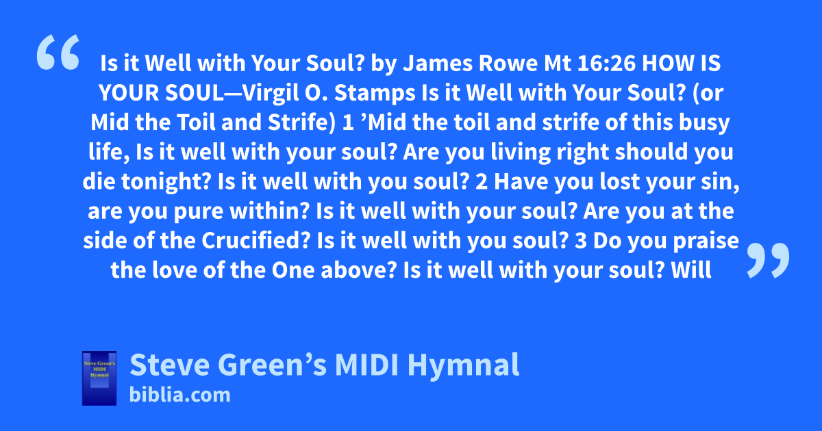 Is it Well with Your Soul? by James Rowe Mt 16:26 HOW IS YOUR SOUL—Virgil O. Stamps Is it Well with Your Soul? (or Mid the Toil and Strife) 1 ’Mid the toil and strife of this busy life, Is it well with your soul? Are you living right should you die tonight? Is it well with you soul? 2 Have you lost your sin, are you pure within? Is it well with your soul? Are you at the side of the Crucified? Is it well with you soul? 3 Do you praise the love of the One above? Is it well with your soul? Will