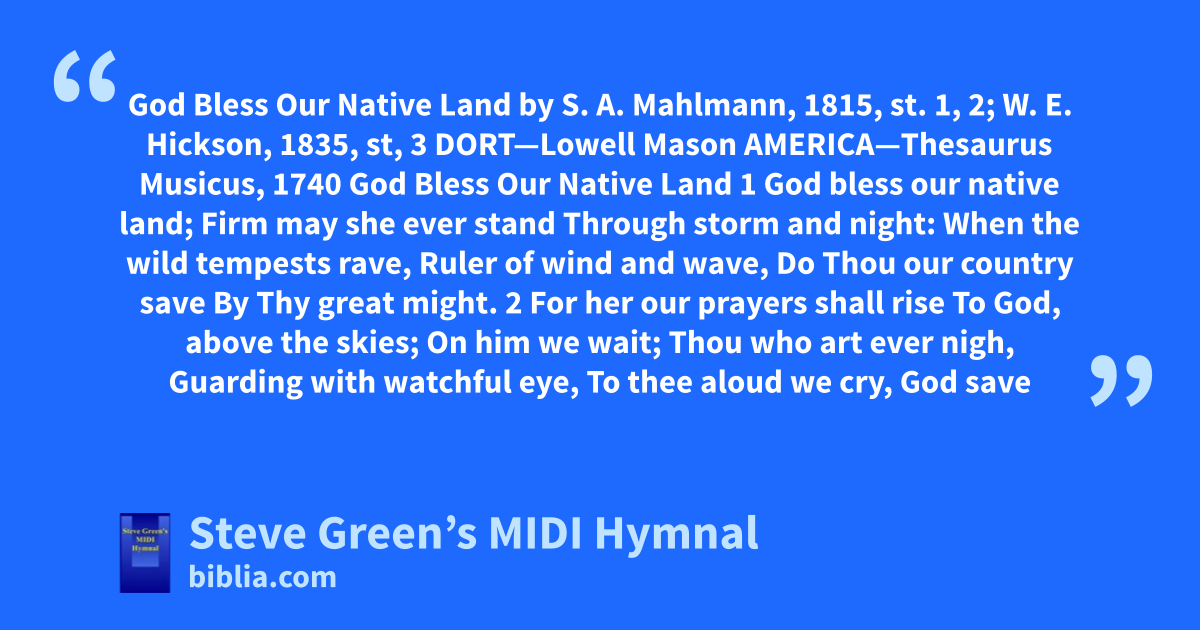 God Bless Our Native Land by S. A. Mahlmann, 1815, st. 1, 2; W. E. Hickson, 1835, st, 3 DORT—Lowell Mason AMERICA—Thesaurus Musicus, 1740 God Bless Our Native Land 1 God bless our native land; Firm may she ever stand Through storm and night: When the wild tempests rave, Ruler of wind and wave, Do Thou our country save By Thy great might. 2 For her our prayers shall rise To God, above the skies; On him we wait; Thou who art ever nigh, Guarding with watchful eye, To thee aloud we cry, God save