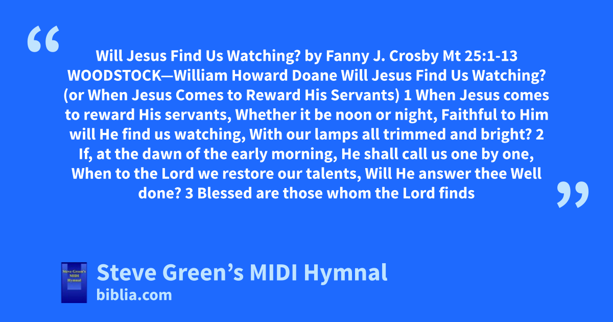 Will Jesus Find Us Watching? by Fanny J. Crosby Mt 25:1-13 WOODSTOCK—William Howard Doane Will Jesus Find Us Watching? (or When Jesus Comes to Reward His Servants) 1 When Jesus comes to reward His servants, Whether it be noon or night, Faithful to Him will He find us watching, With our lamps all trimmed and bright? 2 If, at the dawn of the early morning, He shall call us one by one, When to the Lord we restore our talents, Will He answer thee Well done? 3 Blessed are those whom the Lord finds