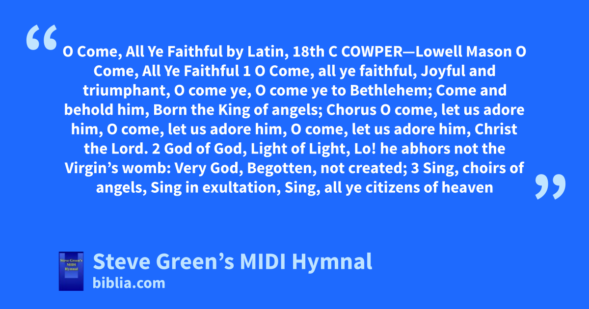 O Come, All Ye Faithful by Latin, 18th C COWPER—Lowell Mason O Come, All Ye Faithful 1 O Come, all ye faithful, Joyful and triumphant, O come ye, O come ye to Bethlehem; Come and behold him, Born the King of angels; Chorus O come, let us adore him, O come, let us adore him, O come, let us adore him, Christ the Lord. 2 God of God, Light of Light, Lo! he abhors not the Virgin’s womb: Very God, Begotten, not created; 3 Sing, choirs of angels, Sing in exultation, Sing, all ye citizens of heaven