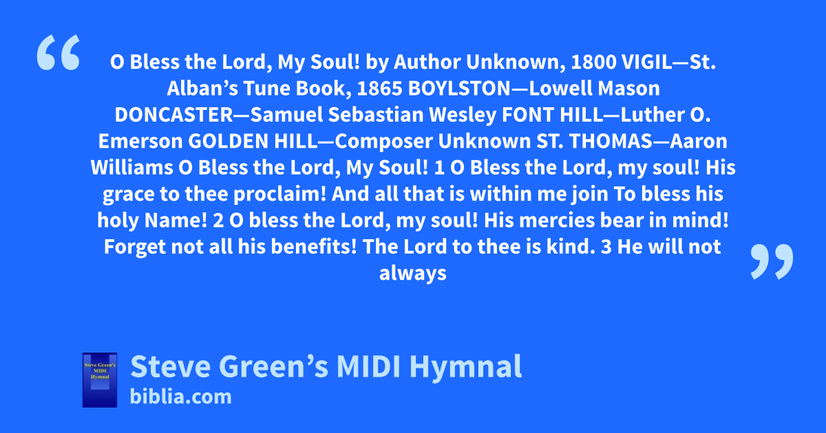 O Bless the Lord, My Soul! by Author Unknown, 1800 VIGIL—St. Alban’s Tune Book, 1865 BOYLSTON—Lowell Mason DONCASTER—Samuel Sebastian Wesley FONT HILL—Luther O. Emerson GOLDEN HILL—Composer Unknown ST. THOMAS—Aaron Williams O Bless the Lord, My Soul! 1 O Bless the Lord, my soul! His grace to thee proclaim! And all that is within me join To bless his holy Name! 2 O bless the Lord, my soul! His mercies bear in mind! Forget not all his benefits! The Lord to thee is kind. 3 He will not always