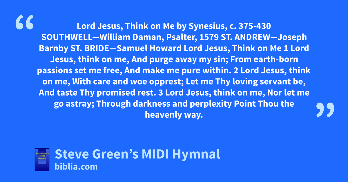 Lord Jesus, Think on Me by Synesius, c. 375-430 SOUTHWELL—William Daman, Psalter, 1579 ST. ANDREW—Joseph Barnby ST. BRIDE—Samuel Howard Lord Jesus, Think on Me 1 Lord Jesus, think on me, And purge away my sin; From earth-born passions set me free, And make me pure within. 2 Lord Jesus, think on me, With care and woe opprest; Let me Thy loving servant be, And taste Thy promised rest. 3 Lord Jesus, think on me, Nor let me go astray; Through darkness and perplexity Point Thou the heavenly way.