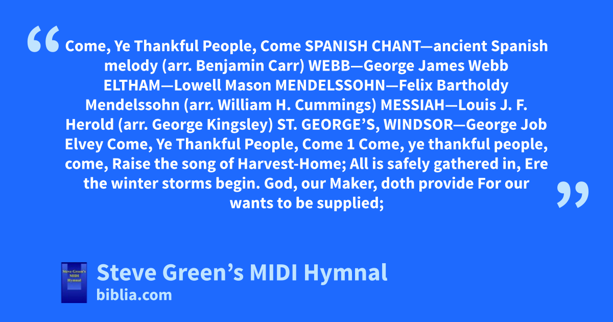 Come, Ye Thankful People, Come SPANISH CHANT—ancient Spanish melody (arr. Benjamin Carr) WEBB—George James Webb ELTHAM—Lowell Mason MENDELSSOHN—Felix Bartholdy Mendelssohn (arr. William H. Cummings) MESSIAH—Louis J. F. Herold (arr. George Kingsley) ST. GEORGE’S, WINDSOR—George Job Elvey Come, Ye Thankful People, Come 1 Come, ye thankful people, come, Raise the song of Harvest-Home; All is safely gathered in, Ere the winter storms begin. God, our Maker, doth provide For our wants to be supplied;