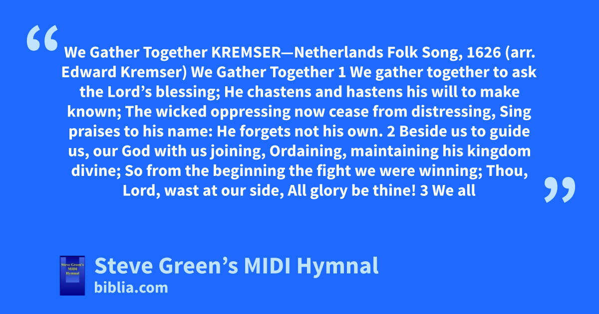 We Gather Together KREMSER—Netherlands Folk Song, 1626 (arr. Edward Kremser) We Gather Together 1 We gather together to ask the Lord’s blessing; He chastens and hastens his will to make known; The wicked oppressing now cease from distressing, Sing praises to his name: He forgets not his own. 2 Beside us to guide us, our God with us joining, Ordaining, maintaining his kingdom divine; So from the beginning the fight we were winning; Thou, Lord, wast at our side, All glory be thine! 3 We all