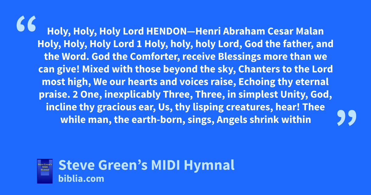 Holy, Holy, Holy Lord HENDON—Henri Abraham Cesar Malan Holy, Holy, Holy Lord 1 Holy, holy, holy Lord, God the father, and the Word. God the Comforter, receive Blessings more than we can give! Mixed with those beyond the sky, Chanters to the Lord most high, We our hearts and voices raise, Echoing thy eternal praise. 2 One, inexplicably Three, Three, in simplest Unity, God, incline thy gracious ear, Us, thy lisping creatures, hear! Thee while man, the earth-born, sings, Angels shrink within
