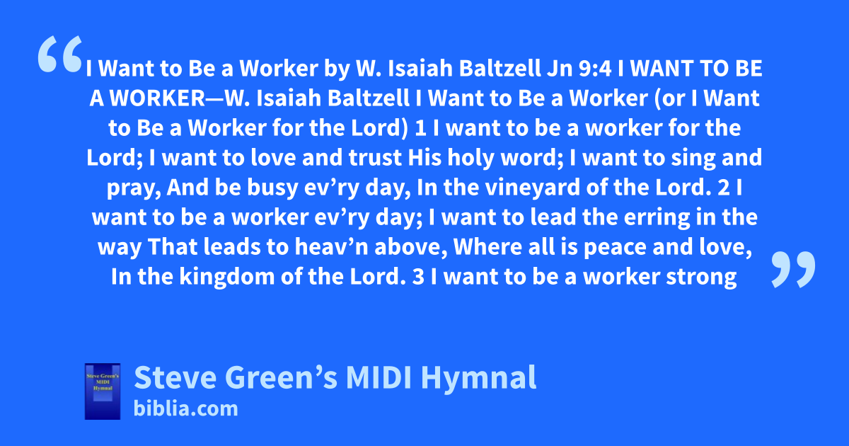 I Want to Be a Worker by W. Isaiah Baltzell Jn 9:4 I WANT TO BE A WORKER—W. Isaiah Baltzell I Want to Be a Worker (or I Want to Be a Worker for the Lord) 1 I want to be a worker for the Lord; I want to love and trust His holy word; I want to sing and pray, And be busy ev’ry day, In the vineyard of the Lord. 2 I want to be a worker ev’ry day; I want to lead the erring in the way That leads to heav’n above, Where all is peace and love, In the kingdom of the Lord. 3 I want to be a worker strong