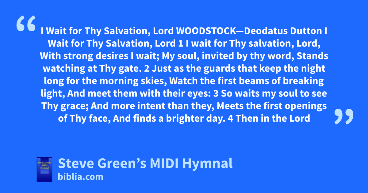 I Wait for Thy Salvation, Lord WOODSTOCK—Deodatus Dutton I Wait for Thy Salvation, Lord 1 I wait for Thy salvation, Lord, With strong desires I wait; My soul, invited by thy word, Stands watching at Thy gate. 2 Just as the guards that keep the night long for the morning skies, Watch the first beams of breaking light, And meet them with their eyes: 3 So waits my soul to see Thy grace; And more intent than they, Meets the first openings of Thy face, And finds a brighter day. 4 Then in the Lord