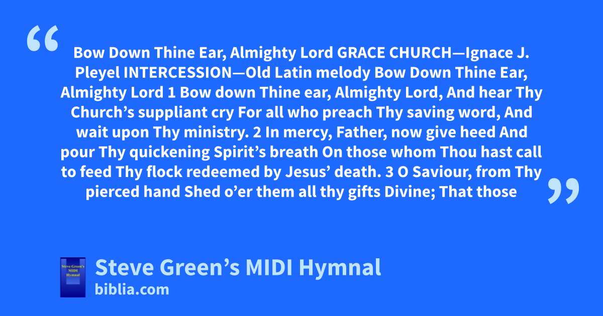 Bow Down Thine Ear, Almighty Lord GRACE CHURCH—Ignace J. Pleyel INTERCESSION—Old Latin melody Bow Down Thine Ear, Almighty Lord 1 Bow down Thine ear, Almighty Lord, And hear Thy Church’s suppliant cry For all who preach Thy saving word, And wait upon Thy ministry. 2 In mercy, Father, now give heed And pour Thy quickening Spirit’s breath On those whom Thou hast call to feed Thy flock redeemed by Jesus’ death. 3 O Saviour, from Thy pierced hand Shed o’er them all thy gifts Divine; That those
