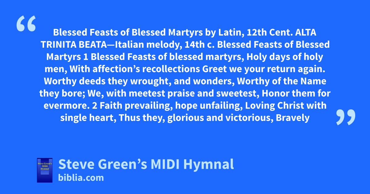 Blessed Feasts of Blessed Martyrs by Latin, 12th Cent. ALTA TRINITA BEATA—Italian melody, 14th c. Blessed Feasts of Blessed Martyrs 1 Blessed Feasts of blessed martyrs, Holy days of holy men, With affection’s recollections Greet we your return again. Worthy deeds they wrought, and wonders, Worthy of the Name they bore; We, with meetest praise and sweetest, Honor them for evermore. 2 Faith prevailing, hope unfailing, Loving Christ with single heart, Thus they, glorious and victorious, Bravely