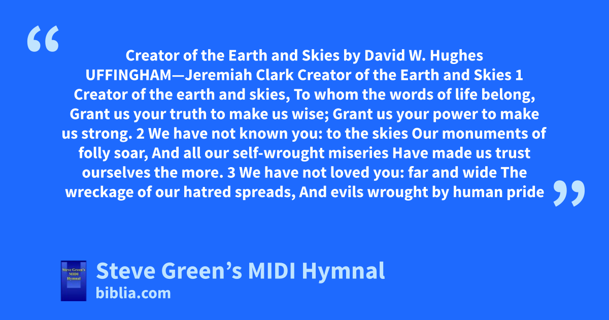 Creator of the Earth and Skies by David W. Hughes UFFINGHAM—Jeremiah Clark Creator of the Earth and Skies 1 Creator of the earth and skies, To whom the words of life belong, Grant us your truth to make us wise; Grant us your power to make us strong. 2 We have not known you: to the skies Our monuments of folly soar, And all our self-wrought miseries Have made us trust ourselves the more. 3 We have not loved you: far and wide The wreckage of our hatred spreads, And evils wrought by human pride
