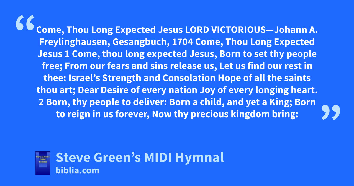 Come, Thou Long Expected Jesus LORD VICTORIOUS—Johann A. Freylinghausen, Gesangbuch, 1704 Come, Thou Long Expected Jesus 1 Come, thou long expected Jesus, Born to set thy people free; From our fears and sins release us, Let us find our rest in thee: Israel’s Strength and Consolation Hope of all the saints thou art; Dear Desire of every nation Joy of every longing heart. 2 Born, thy people to deliver: Born a child, and yet a King; Born to reign in us forever, Now thy precious kingdom bring: