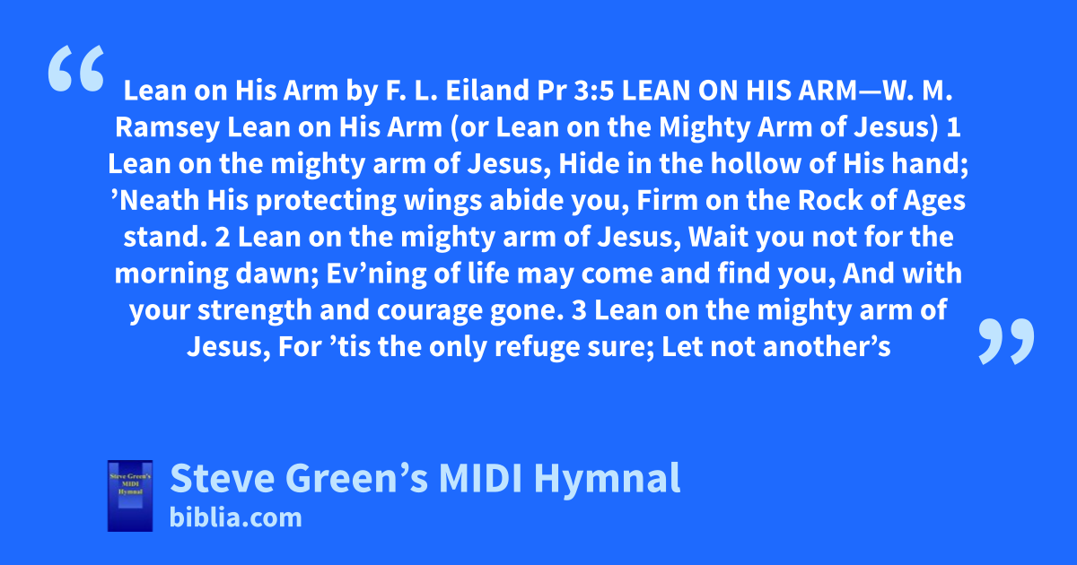 Lean on His Arm by F. L. Eiland Pr 3:5 LEAN ON HIS ARM—W. M. Ramsey Lean on His Arm (or Lean on the Mighty Arm of Jesus) 1 Lean on the mighty arm of Jesus, Hide in the hollow of His hand; ’Neath His protecting wings abide you, Firm on the Rock of Ages stand. 2 Lean on the mighty arm of Jesus, Wait you not for the morning dawn; Ev’ning of life may come and find you, And with your strength and courage gone. 3 Lean on the mighty arm of Jesus, For ’tis the only refuge sure; Let not another’s