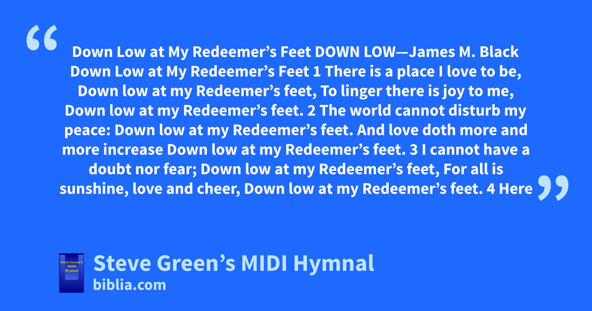 Down Low at My Redeemer’s Feet DOWN LOW—James M. Black Down Low at My Redeemer’s Feet 1 There is a place I love to be, Down low at my Redeemer’s feet, To linger there is joy to me, Down low at my Redeemer’s feet. 2 The world cannot disturb my peace: Down low at my Redeemer’s feet. And love doth more and more increase Down low at my Redeemer’s feet. 3 I cannot have a doubt nor fear; Down low at my Redeemer’s feet, For all is sunshine, love and cheer, Down low at my Redeemer’s feet. 4 Here