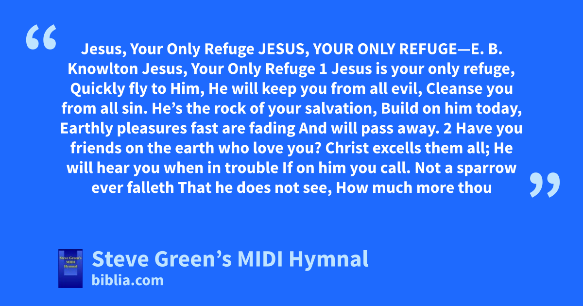 Jesus, Your Only Refuge JESUS, YOUR ONLY REFUGE—E. B. Knowlton Jesus, Your Only Refuge 1 Jesus is your only refuge, Quickly fly to Him, He will keep you from all evil, Cleanse you from all sin. He’s the rock of your salvation, Build on him today, Earthly pleasures fast are fading And will pass away. 2 Have you friends on the earth who love you? Christ excells them all; He will hear you when in trouble If on him you call. Not a sparrow ever falleth That he does not see, How much more thou