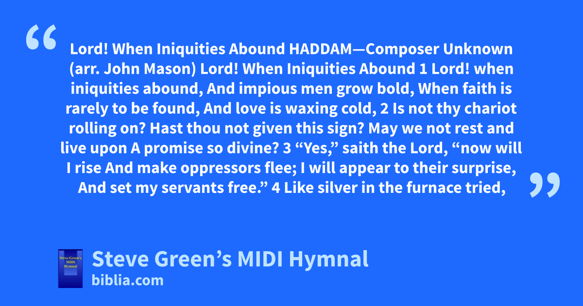 Lord! When Iniquities Abound HADDAM—Composer Unknown (arr. John Mason) Lord! When Iniquities Abound 1 Lord! when iniquities abound, And impious men grow bold, When faith is rarely to be found, And love is waxing cold, 2 Is not thy chariot rolling on? Hast thou not given this sign? May we not rest and live upon A promise so divine? 3 “Yes,” saith the Lord, “now will I rise And make oppressors flee; I will appear to their surprise, And set my servants free.” 4 Like silver in the furnace tried,
