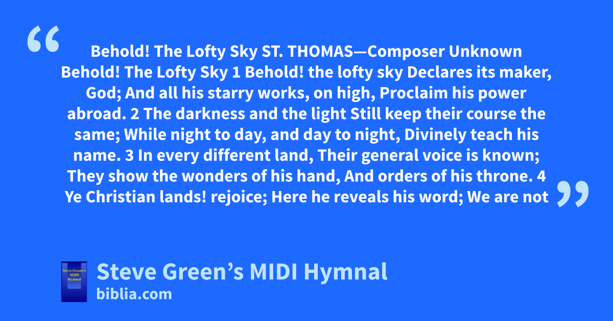 Behold! The Lofty Sky ST. THOMAS—Composer Unknown Behold! The Lofty Sky 1 Behold! the lofty sky Declares its maker, God; And all his starry works, on high, Proclaim his power abroad. 2 The darkness and the light Still keep their course the same; While night to day, and day to night, Divinely teach his name. 3 In every different land, Their general voice is known; They show the wonders of his hand, And orders of his throne. 4 Ye Christian lands! rejoice; Here he reveals his word; We are not