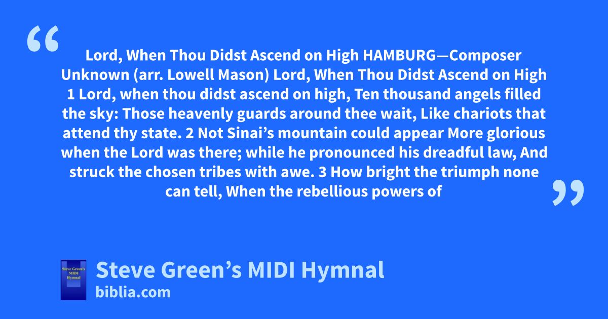 Lord, When Thou Didst Ascend on High HAMBURG—Composer Unknown (arr. Lowell Mason) Lord, When Thou Didst Ascend on High 1 Lord, when thou didst ascend on high, Ten thousand angels filled the sky: Those heavenly guards around thee wait, Like chariots that attend thy state. 2 Not Sinai’s mountain could appear More glorious when the Lord was there; while he pronounced his dreadful law, And struck the chosen tribes with awe. 3 How bright the triumph none can tell, When the rebellious powers of