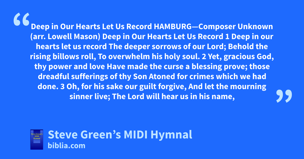 Deep in Our Hearts Let Us Record HAMBURG—Composer Unknown (arr. Lowell Mason) Deep in Our Hearts Let Us Record 1 Deep in our hearts let us record The deeper sorrows of our Lord; Behold the rising billows roll, To overwhelm his holy soul. 2 Yet, gracious God, thy power and love Have made the curse a blessing prove; those dreadful sufferings of thy Son Atoned for crimes which we had done. 3 Oh, for his sake our guilt forgive, And let the mourning sinner live; The Lord will hear us in his name,