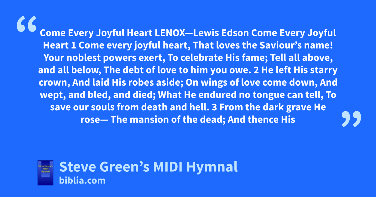 Come Every Joyful Heart LENOX—Lewis Edson Come Every Joyful Heart 1 Come every joyful heart, That loves the Saviour’s name! Your noblest powers exert, To celebrate His fame; Tell all above, and all below, The debt of love to him you owe. 2 He left His starry crown, And laid His robes aside; On wings of love come down, And wept, and bled, and died; What He endured no tongue can tell, To save our souls from death and hell. 3 From the dark grave He rose— The mansion of the dead; And thence His