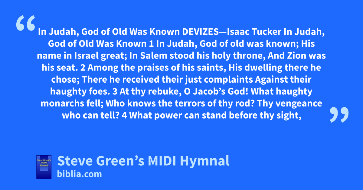 In Judah, God of Old Was Known DEVIZES—Isaac Tucker In Judah, God of Old Was Known 1 In Judah, God of old was known; His name in Israel great; In Salem stood his holy throne, And Zion was his seat. 2 Among the praises of his saints, His dwelling there he chose; There he received their just complaints Against their haughty foes. 3 At thy rebuke, O Jacob’s God! What haughty monarchs fell; Who knows the terrors of thy rod? Thy vengeance who can tell? 4 What power can stand before thy sight,