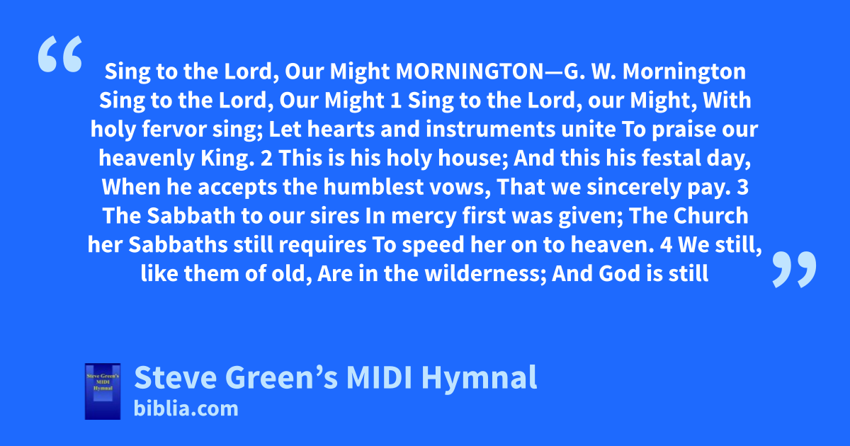 Sing to the Lord, Our Might MORNINGTON—G. W. Mornington Sing to the Lord, Our Might 1 Sing to the Lord, our Might, With holy fervor sing; Let hearts and instruments unite To praise our heavenly King. 2 This is his holy house; And this his festal day, When he accepts the humblest vows, That we sincerely pay. 3 The Sabbath to our sires In mercy first was given; The Church her Sabbaths still requires To speed her on to heaven. 4 We still, like them of old, Are in the wilderness; And God is still