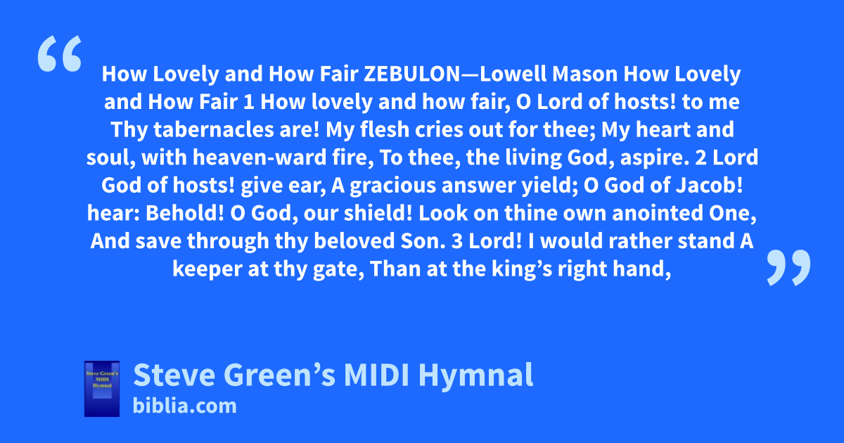 How Lovely and How Fair ZEBULON—Lowell Mason How Lovely and How Fair 1 How lovely and how fair, O Lord of hosts! to me Thy tabernacles are! My flesh cries out for thee; My heart and soul, with heaven-ward fire, To thee, the living God, aspire. 2 Lord God of hosts! give ear, A gracious answer yield; O God of Jacob! hear: Behold! O God, our shield! Look on thine own anointed One, And save through thy beloved Son. 3 Lord! I would rather stand A keeper at thy gate, Than at the king’s right hand,