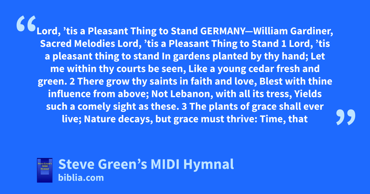 Lord, ’tis a Pleasant Thing to Stand GERMANY—William Gardiner, Sacred Melodies Lord, ’tis a Pleasant Thing to Stand 1 Lord, ’tis a pleasant thing to stand In gardens planted by thy hand; Let me within thy courts be seen, Like a young cedar fresh and green. 2 There grow thy saints in faith and love, Blest with thine influence from above; Not Lebanon, with all its tress, Yields such a comely sight as these. 3 The plants of grace shall ever live; Nature decays, but grace must thrive: Time, that