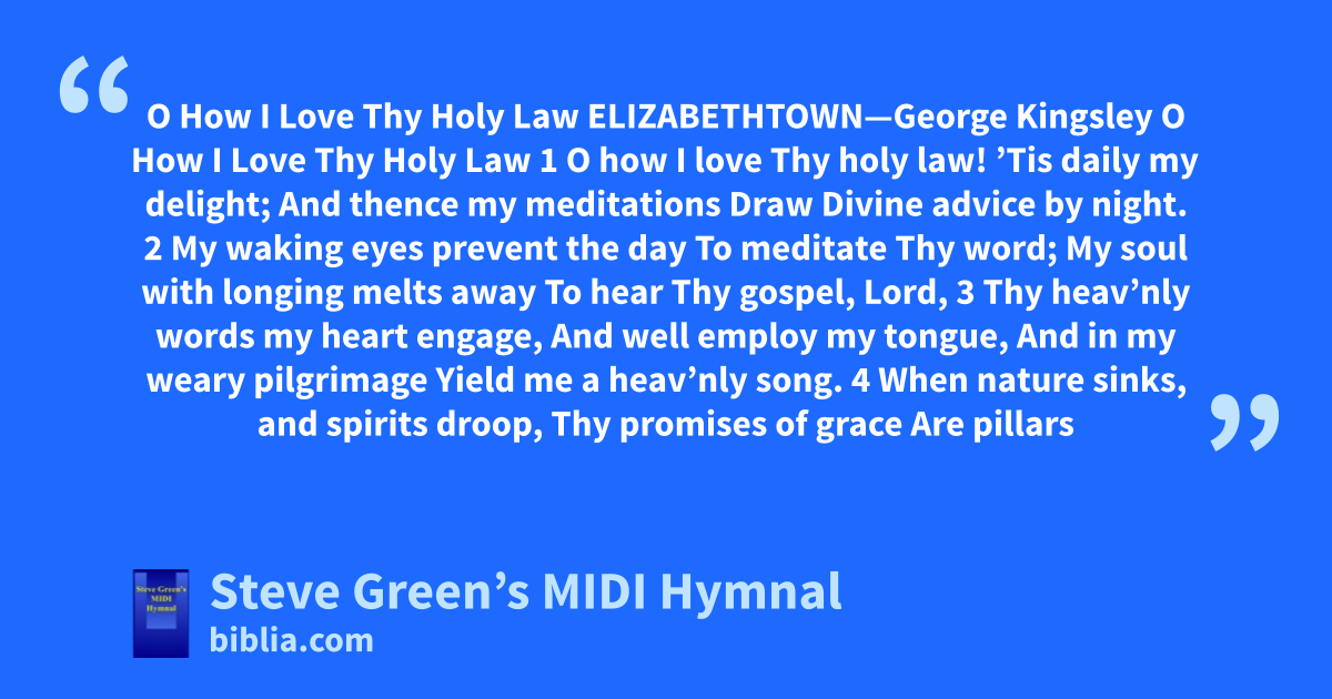 O How I Love Thy Holy Law ELIZABETHTOWN—George Kingsley O How I Love Thy Holy Law 1 O how I love Thy holy law! ’Tis daily my delight; And thence my meditations Draw Divine advice by night. 2 My waking eyes prevent the day To meditate Thy word; My soul with longing melts away To hear Thy gospel, Lord, 3 Thy heav’nly words my heart engage, And well employ my tongue, And in my weary pilgrimage Yield me a heav’nly song. 4 When nature sinks, and spirits droop, Thy promises of grace Are pillars