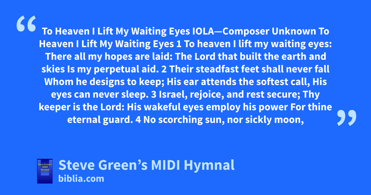 To Heaven I Lift My Waiting Eyes IOLA—Composer Unknown To Heaven I Lift My Waiting Eyes 1 To heaven I lift my waiting eyes: There all my hopes are laid: The Lord that built the earth and skies Is my perpetual aid. 2 Their steadfast feet shall never fall Whom he designs to keep; His ear attends the softest call, His eyes can never sleep. 3 Israel, rejoice, and rest secure; Thy keeper is the Lord: His wakeful eyes employ his power For thine eternal guard. 4 No scorching sun, nor sickly moon,