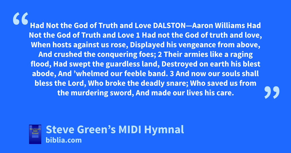 Had Not the God of Truth and Love DALSTON—Aaron Williams Had Not the God of Truth and Love 1 Had not the God of truth and love, When hosts against us rose, Displayed his vengeance from above, And crushed the conquering foes; 2 Their armies like a raging flood, Had swept the guardless land, Destroyed on earth his blest abode, And ’whelmed our feeble band. 3 And now our souls shall bless the Lord, Who broke the deadly snare; Who saved us from the murdering sword, And made our lives his care.