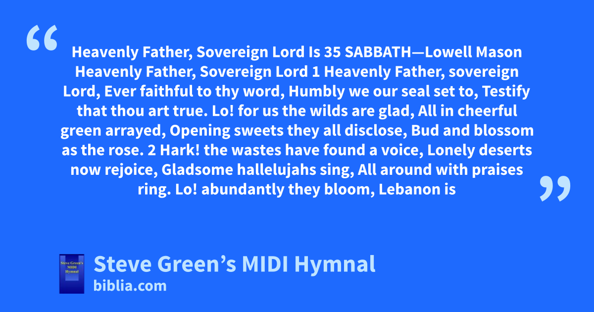 Heavenly Father, Sovereign Lord Is 35 SABBATH—Lowell Mason Heavenly Father, Sovereign Lord 1 Heavenly Father, sovereign Lord, Ever faithful to thy word, Humbly we our seal set to, Testify that thou art true. Lo! for us the wilds are glad, All in cheerful green arrayed, Opening sweets they all disclose, Bud and blossom as the rose. 2 Hark! the wastes have found a voice, Lonely deserts now rejoice, Gladsome hallelujahs sing, All around with praises ring. Lo! abundantly they bloom, Lebanon is