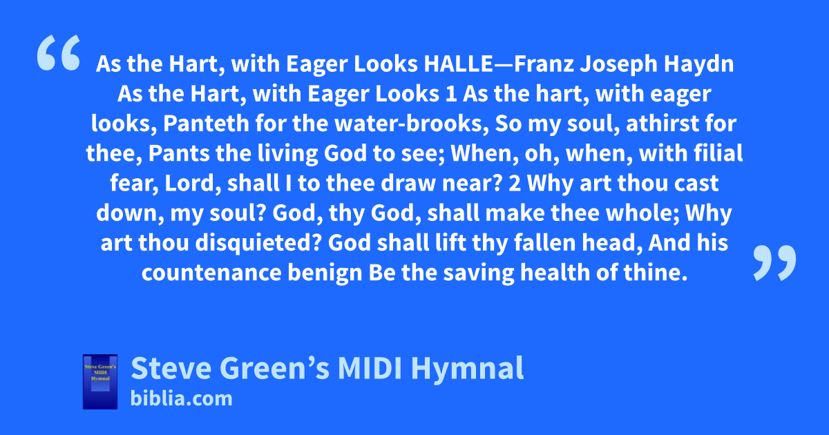 As the Hart, with Eager Looks HALLE—Franz Joseph Haydn As the Hart, with Eager Looks 1 As the hart, with eager looks, Panteth for the water-brooks, So my soul, athirst for thee, Pants the living God to see; When, oh, when, with filial fear, Lord, shall I to thee draw near? 2 Why art thou cast down, my soul? God, thy God, shall make thee whole; Why art thou disquieted? God shall lift thy fallen head, And his countenance benign Be the saving health of thine.