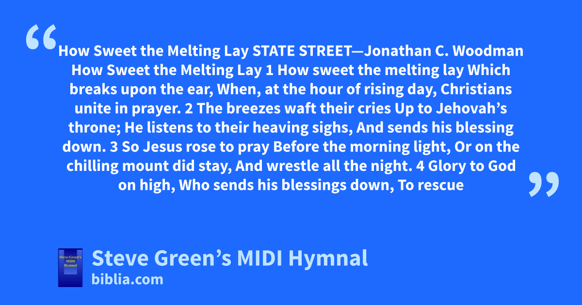 How Sweet the Melting Lay STATE STREET—Jonathan C. Woodman How Sweet the Melting Lay 1 How sweet the melting lay Which breaks upon the ear, When, at the hour of rising day, Christians unite in prayer. 2 The breezes waft their cries Up to Jehovah’s throne; He listens to their heaving sighs, And sends his blessing down. 3 So Jesus rose to pray Before the morning light, Or on the chilling mount did stay, And wrestle all the night. 4 Glory to God on high, Who sends his blessings down, To rescue