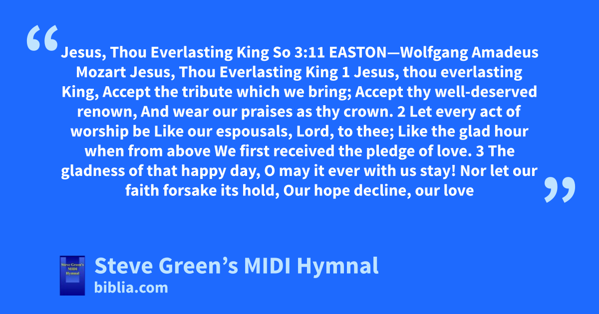 Jesus, Thou Everlasting King So 3:11 EASTON—Wolfgang Amadeus Mozart Jesus, Thou Everlasting King 1 Jesus, thou everlasting King, Accept the tribute which we bring; Accept thy well-deserved renown, And wear our praises as thy crown. 2 Let every act of worship be Like our espousals, Lord, to thee; Like the glad hour when from above We first received the pledge of love. 3 The gladness of that happy day, O may it ever with us stay! Nor let our faith forsake its hold, Our hope decline, our love