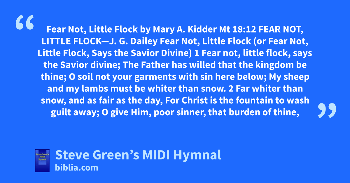Fear Not, Little Flock by Mary A. Kidder Mt 18:12 FEAR NOT, LITTLE FLOCK—J. G. Dailey Fear Not, Little Flock (or Fear Not, Little Flock, Says the Savior Divine) 1 Fear not, little flock, says the Savior divine; The Father has willed that the kingdom be thine; O soil not your garments with sin here below; My sheep and my lambs must be whiter than snow. 2 Far whiter than snow, and as fair as the day, For Christ is the fountain to wash guilt away; O give Him, poor sinner, that burden of thine,
