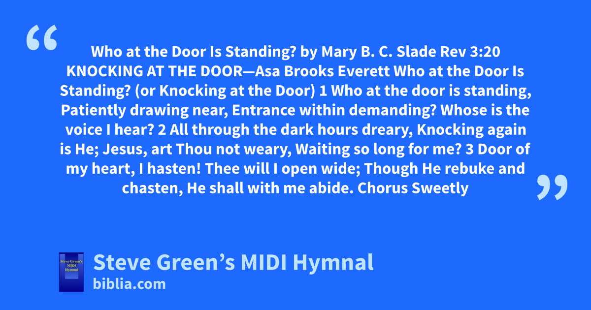 Who at the Door Is Standing? by Mary B. C. Slade Rev 3:20 KNOCKING AT THE DOOR—Asa Brooks Everett Who at the Door Is Standing? (or Knocking at the Door) 1 Who at the door is standing, Patiently drawing near, Entrance within demanding? Whose is the voice I hear? 2 All through the dark hours dreary, Knocking again is He; Jesus, art Thou not weary, Waiting so long for me? 3 Door of my heart, I hasten! Thee will I open wide; Though He rebuke and chasten, He shall with me abide. Chorus Sweetly