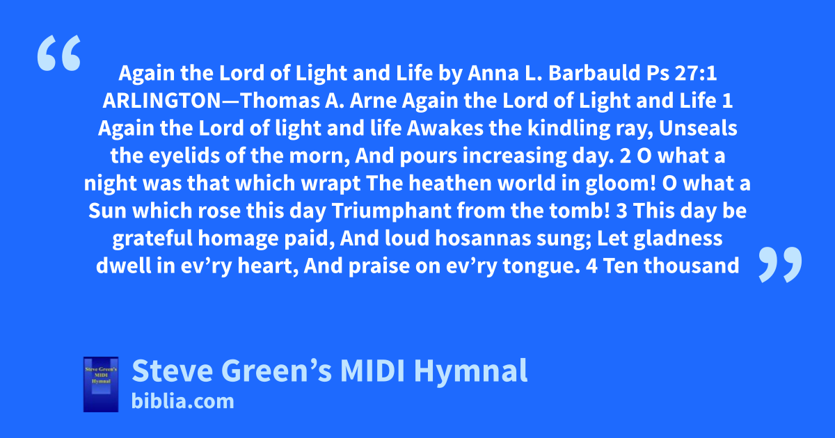 Again the Lord of Light and Life by Anna L. Barbauld Ps 27:1 ARLINGTON—Thomas A. Arne Again the Lord of Light and Life 1 Again the Lord of light and life Awakes the kindling ray, Unseals the eyelids of the morn, And pours increasing day. 2 O what a night was that which wrapt The heathen world in gloom! O what a Sun which rose this day Triumphant from the tomb! 3 This day be grateful homage paid, And loud hosannas sung; Let gladness dwell in ev’ry heart, And praise on ev’ry tongue. 4 Ten thousand