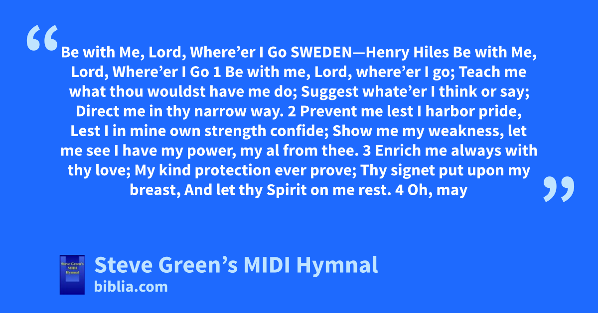 Be with Me, Lord, Where’er I Go SWEDEN—Henry Hiles Be with Me, Lord, Where’er I Go 1 Be with me, Lord, where’er I go; Teach me what thou wouldst have me do; Suggest whate’er I think or say; Direct me in thy narrow way. 2 Prevent me lest I harbor pride, Lest I in mine own strength confide; Show me my weakness, let me see I have my power, my al from thee. 3 Enrich me always with thy love; My kind protection ever prove; Thy signet put upon my breast, And let thy Spirit on me rest. 4 Oh, may
