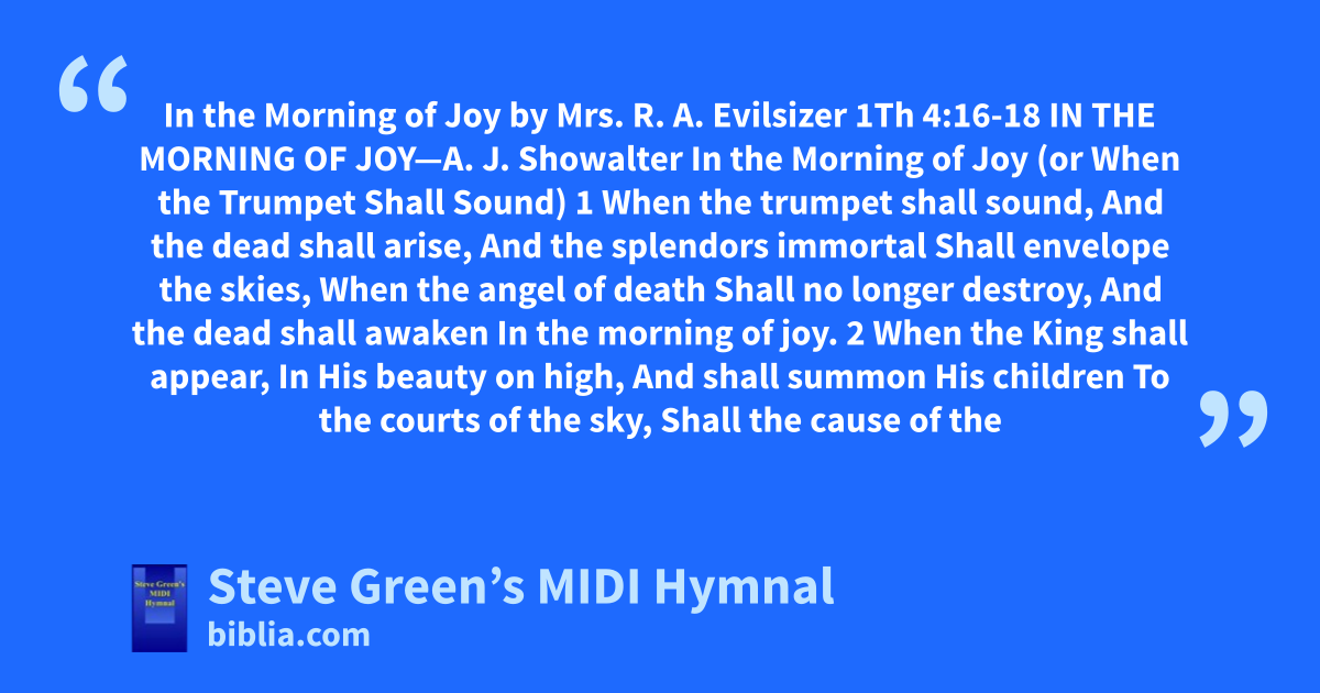 In the Morning of Joy by Mrs. R. A. Evilsizer 1Th 4:16-18 IN THE MORNING OF JOY—A. J. Showalter In the Morning of Joy (or When the Trumpet Shall Sound) 1 When the trumpet shall sound, And the dead shall arise, And the splendors immortal Shall envelope the skies, When the angel of death Shall no longer destroy, And the dead shall awaken In the morning of joy. 2 When the King shall appear, In His beauty on high, And shall summon His children To the courts of the sky, Shall the cause of the